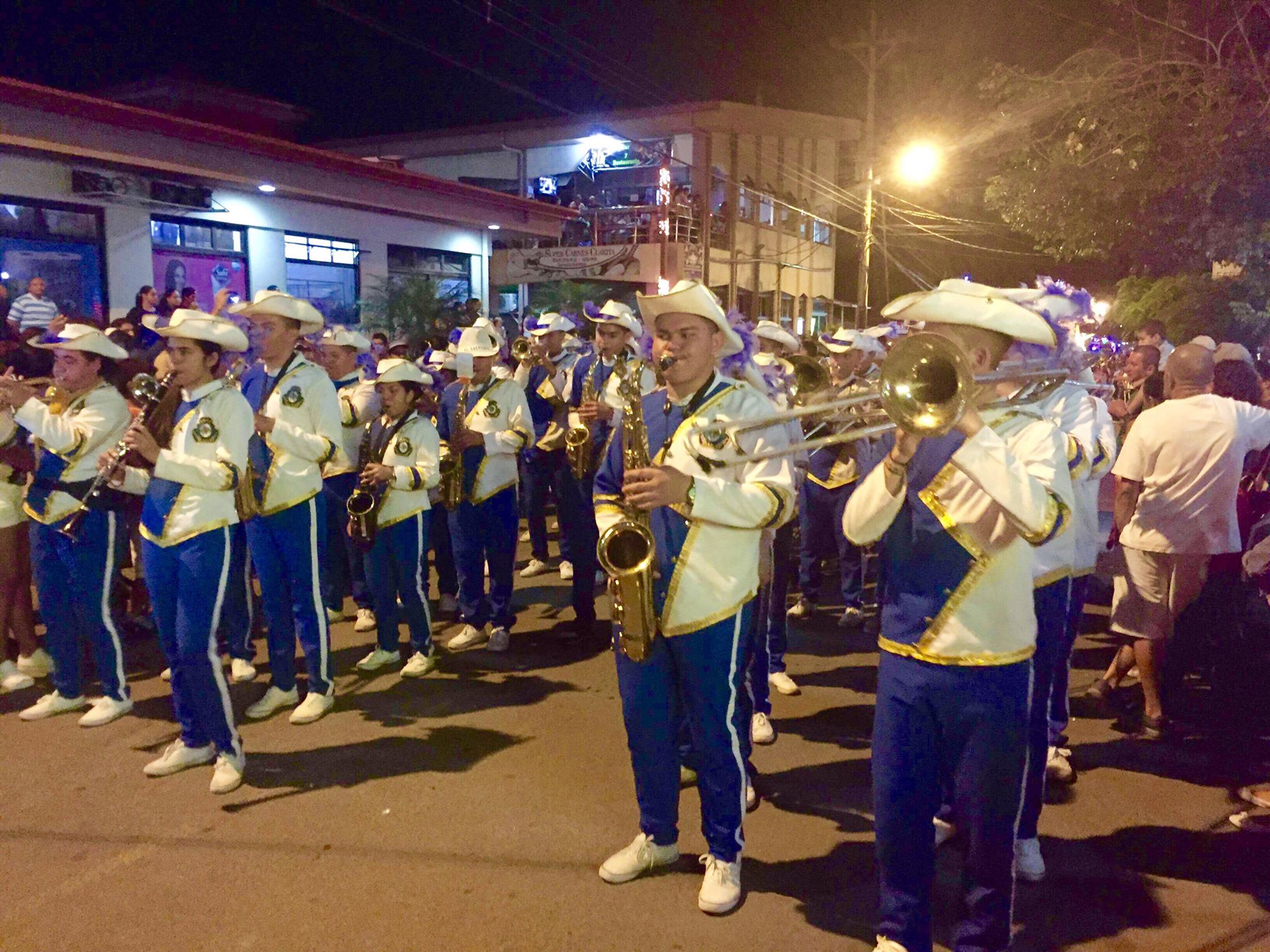 At first glance, it didn’t seem like there would be a whole lot of action when we pulled up to The Festival Of Lights event this year in Cobano. Small pockets of chatter & intensity are sprinkled across the main drag. Vendors selling red Santa hats with flashing lights on them. We set up camp in front of Super Maya and sit down on the curb. Anna & I figure it’d be nice to check out the holiday scene while Violetta parties with a few of her schoolmates, kicking off her Summer vacation with a bang. A definitively festive buzz swirls in the air, and rather quickly that buzz morphs into a frenzy of color, music, flying candy, and fevered dance performances. Sidewalks and street corners fill and pack in with a deceptively exponential swell as the front hem of the crowd spills forward onto the glittering asphalt course. Out of the joyous masses, my daughter manages to pluck a few sugar plums. Several of her friends happen to be on the same stretch of observance. No formal plan or rendezvous had been made. Warm greetings amongst the parents and playtime commences. The dazzling procession rolls out 45 minutes late, led by a couple of Jeepmas Trees adorned with vibrant Christmas lights. Bus loads of band members march melodiously, forming a pulsating musical snake which stretches to the back of town, tail coiling around the community center, the birthplace of the parade. Drumming the holiday into proper perspective, trumpeting in the start of Costa Rican Summer and the ecstasy of vacation. Marching bands from all over the country traveled to Cobano as did performers from Ecuador, El Salvador, Guatemala, and Honduras. Each band bringing tremendous passion and flavor, with the Hondurans being especially saucy to close out the show. What an extravaganza!!! Once the gyrating tail of the musically lit BoaConductor disappears around the corner of the main intersection, the elated crowd begins to slowly disperse. Hoping to beat any likeminded patrons to the proverbial punch, we hug and kiss our tribe goodbye and streak across the street to snag some crispy fried chicken with tangy hot sauce and soft corn tortillas. Seated and served the “food crack” first and just ahead of a gaggle of half-starving stragglers, satisfaction reaches a pinnacle. Ice cold beer to wash it all down and we skip and sing all the way back to Tambor Beach. Traffic thick with the sugar of celebration, the music from the gargantuan collection of after-parties on the main road booms across the landscape as children ricochet within bubbly bounce-houses and adults dance the night away on shiny tiled floors, lights flashing overhead. The warm glow of the holiday season washes over everyone in attendance, and we are truly blessed to be counted in that grouping. We will certainly be making formal plans for The Festival of Lights next year- a rendezvous has been earned