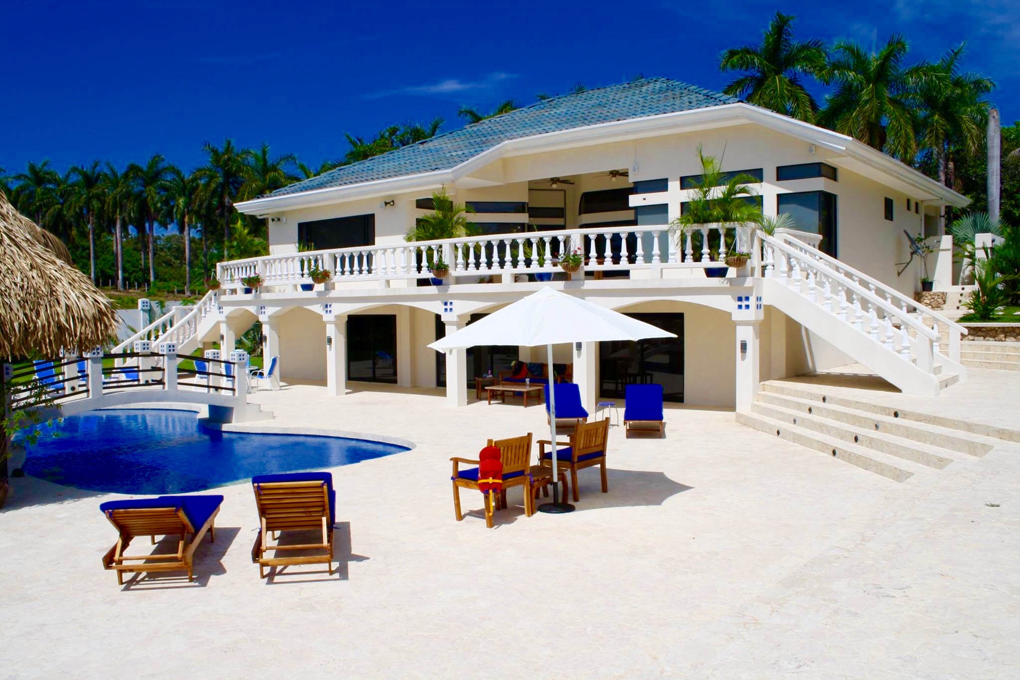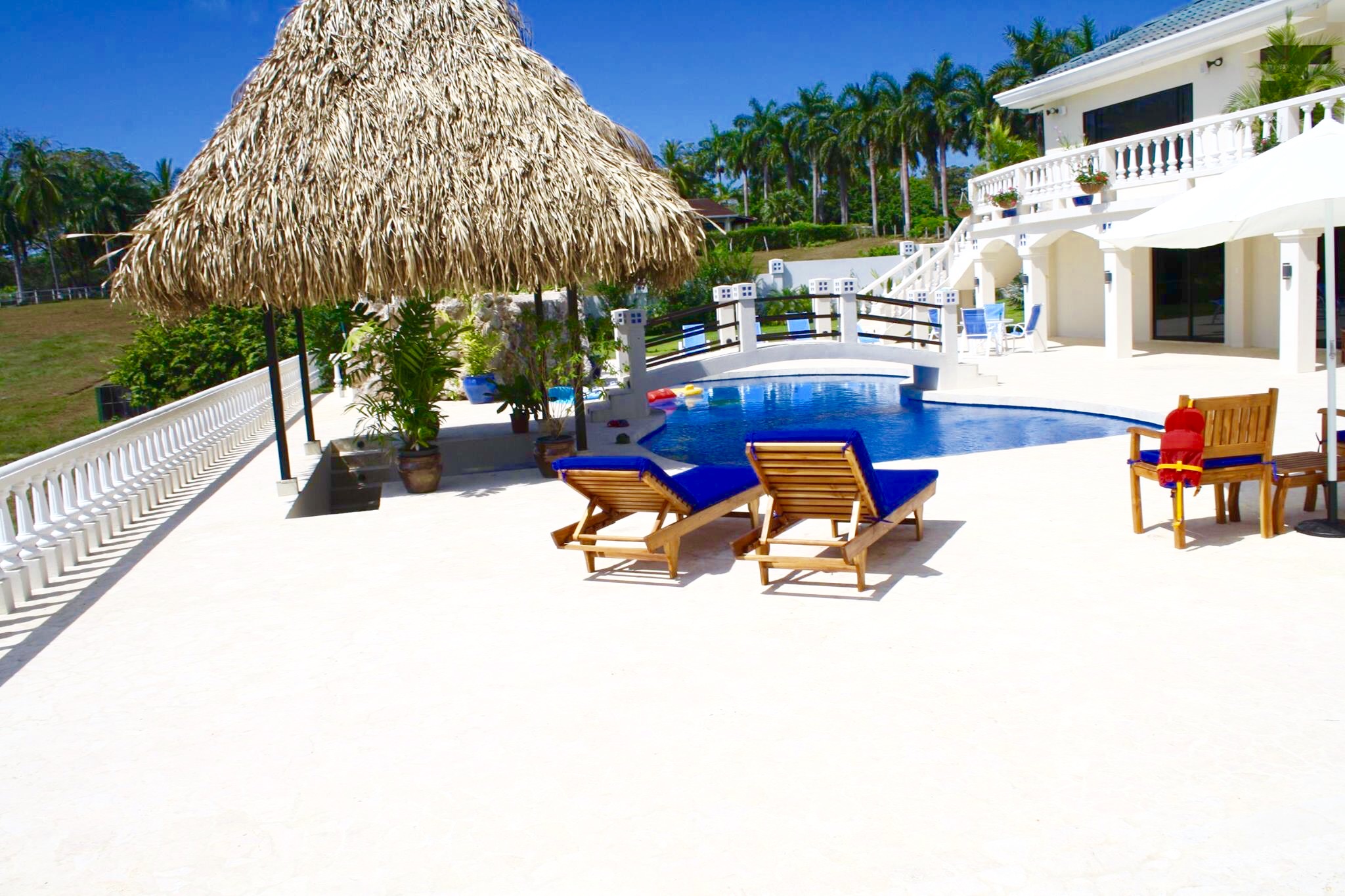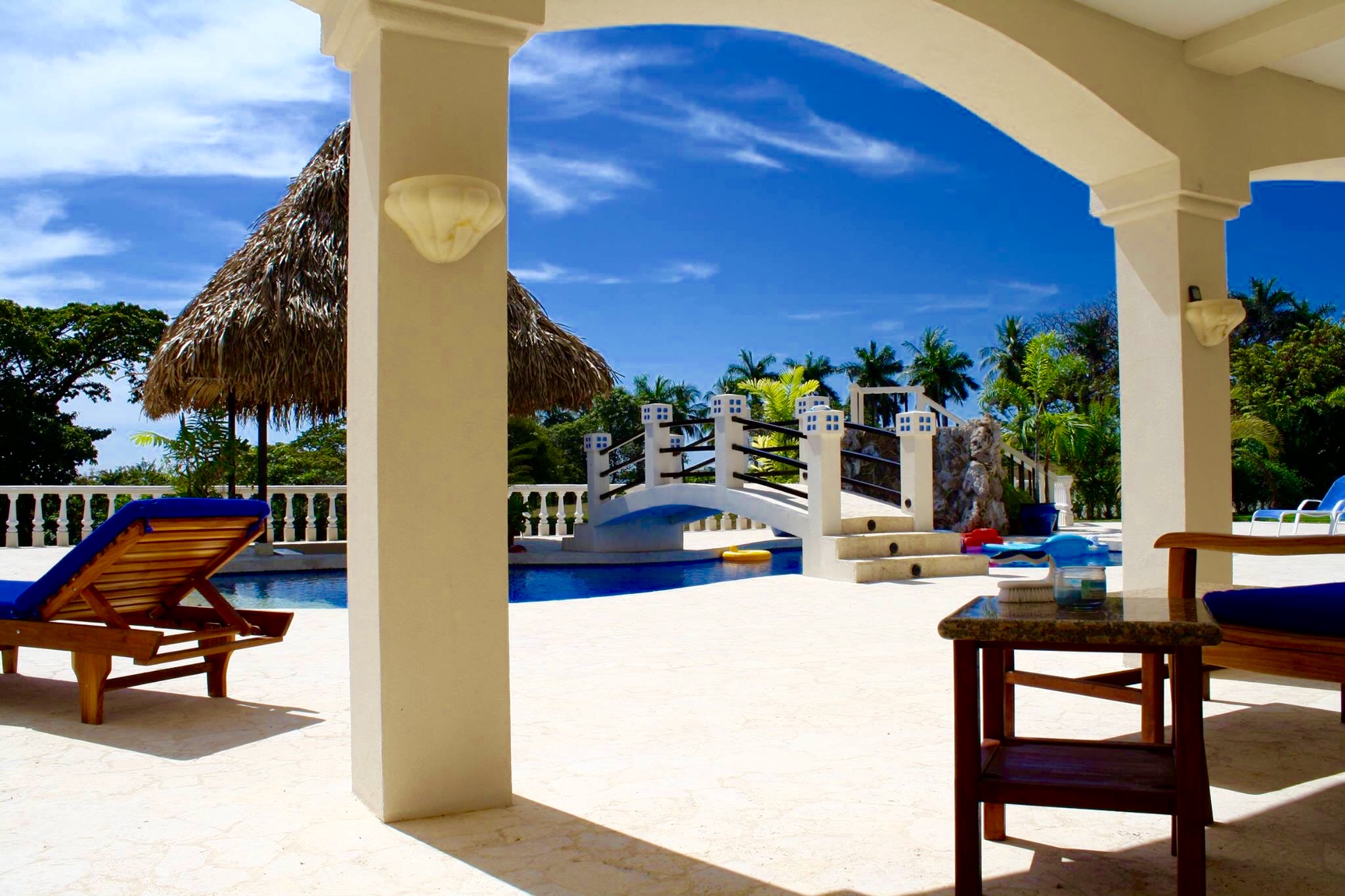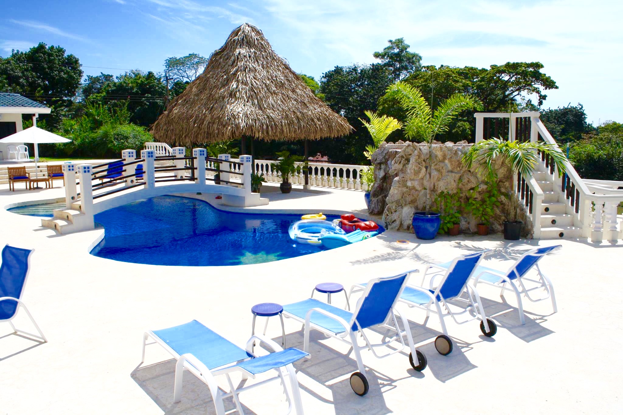 Have you ever thought about owning a private luxury oasis within the lush jungles of Costa Rica? Me, too. This impressive piece of real estate will be the crown jewel on your portfolio. The property is located across from the 1st tee of the Tango Mar golf course and is within easy walking distance of the beach. It consists of a total of eight (8) bedrooms, four and a half (4.5) bathrooms, and an entire world of outdoor space to play around in and enjoy. All of this grandeur is sprawled out comfortably across 3,000 m2 (roughly 3/4 acre) of tastefully landscaped grounds, adorned with beautiful flowers and productive fruit trees on a vibrant green lawn. The main house consists of 557 m2 (6,000 square feet) of pristine craftsmanship and displays a tropical modern decorum. Sculptured marble floors, vaulted ceilings, gleaming hardwood planks, granite counter-tops, kitchen island with a stellar view, hand-crafted wooden cabinets, high-end fixtures and appliances, hot water throughout, fully furnished and 100% turn-key with comfortable beds, built-in handcrafted shelving / entertainment center, plush leather couches, patio furniture, etc.etc.etc, all decorated with great style. A complete inventory list of the items included in the sale will be provided prior to closing and they are estimated to be worth a minimum of $100,000 all on their own. The main house contains six (6) of the bedrooms. There are 4 bedrooms upstairs along with the grand foyer, the dining area, and the spacious open-concept kitchen & living-room which spills out onto the upper terrace. All bedrooms have “black out” curtains to give deep, restful sleep. The Master Suite has Venetian stucco walls and the Master Bath has a Jacuzzi tub and a double sink & shower. Downstairs is an independent, Spanish-styled unit with two bedrooms and an open-floor plan that opens up onto an elegant first floor patio with an in-ground swimming pool, a waterfall jacuzzi, and a swim up bar. There are over 465 m2 (5,000 gorgeous square feet) of decking made from petrified coral… This space is magical and would be ideal for weddings, yoga retreats, family reunions, epic vacation rentals, catered/ special events, and if you’re an especially fortunate one… full-time living in a tropical family compound. The possibilities are endless regarding flexibility and potential cash flow for this unique property. A two-bedroom casita off the pool deck rounds out the eight (8) bedrooms aforementioned and can be rented out separately or used in concert with the rest of the estate. The property has a full perimeter wall, an underground sprinkler system, a full stereo/ speaker system both inside and out, a separate caretaker’s unit for the full-time resident gardener and maid, a plethora of fruit trees (guanábana, “blood orange”, grapefruit, and lime), and all the high-end appliances, furnishings, and turn-key items included in the sale for the ridiculous bargain price of $595,000 USD. It would not be possible to rebuild/ replace this property right now for less than approximately 1.5 million USD based on current building and materials costs, so whoever is savvy enough to jump on this rare opportunity will be making their money on the front end of this purchase. The furnishings, appliances, and turn key items alone are worth over $100,000 USD, so $595,000 USD is a STEAL for this luxury property. The owners are not desperate to sell, but rather they are eager to use the proceeds of the sale to further fuel another successful endeavor of theirs in Costa Rica. Serious buyers only. Asking price firm. Pura Vida.