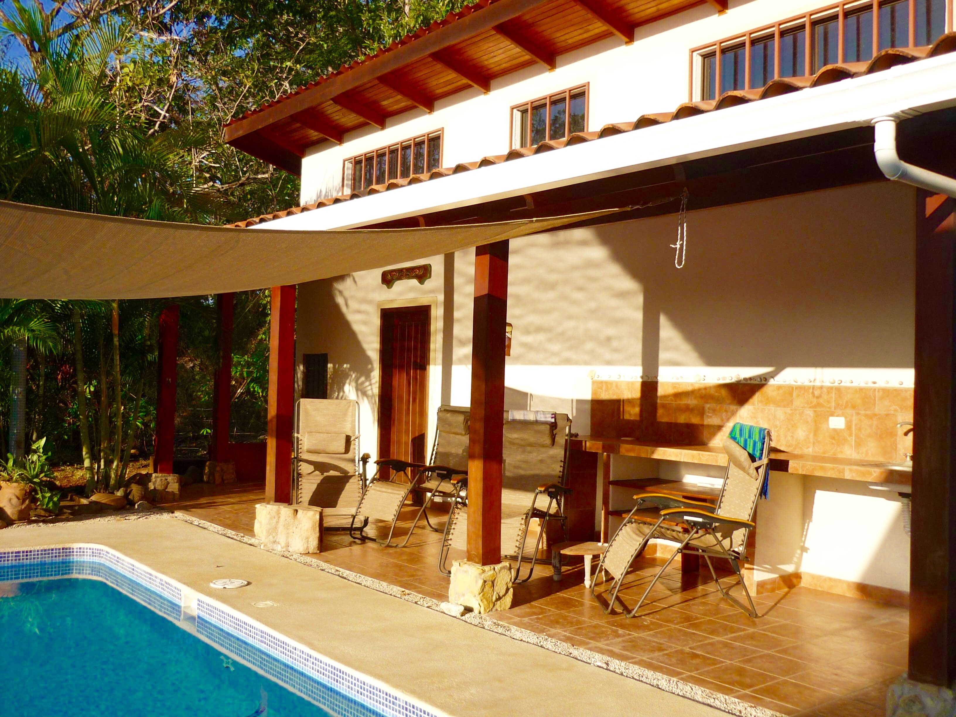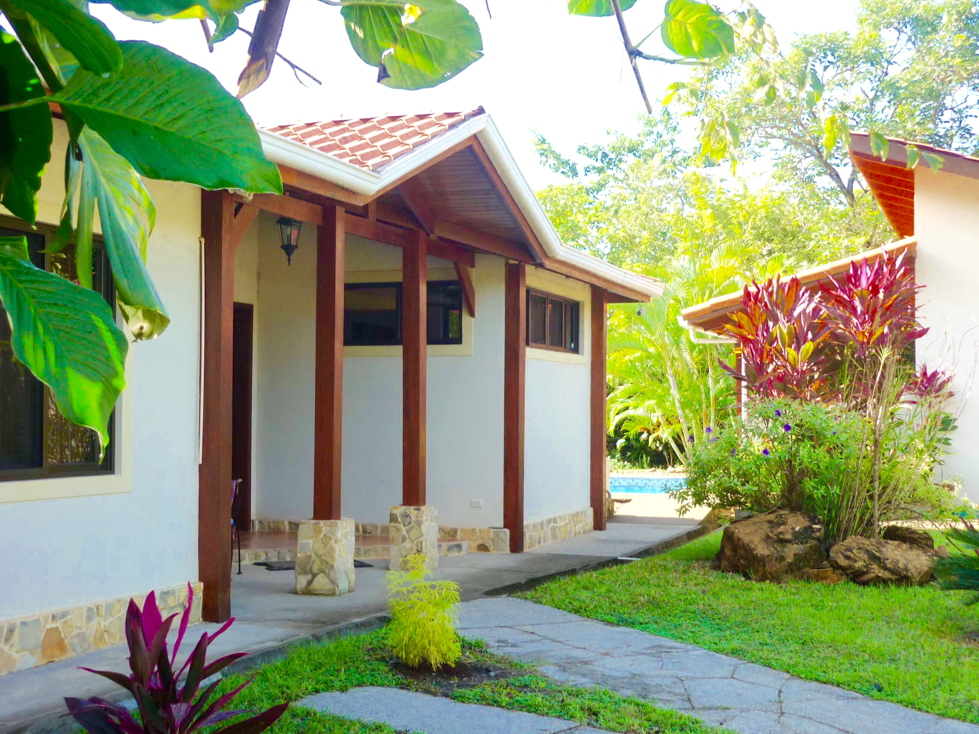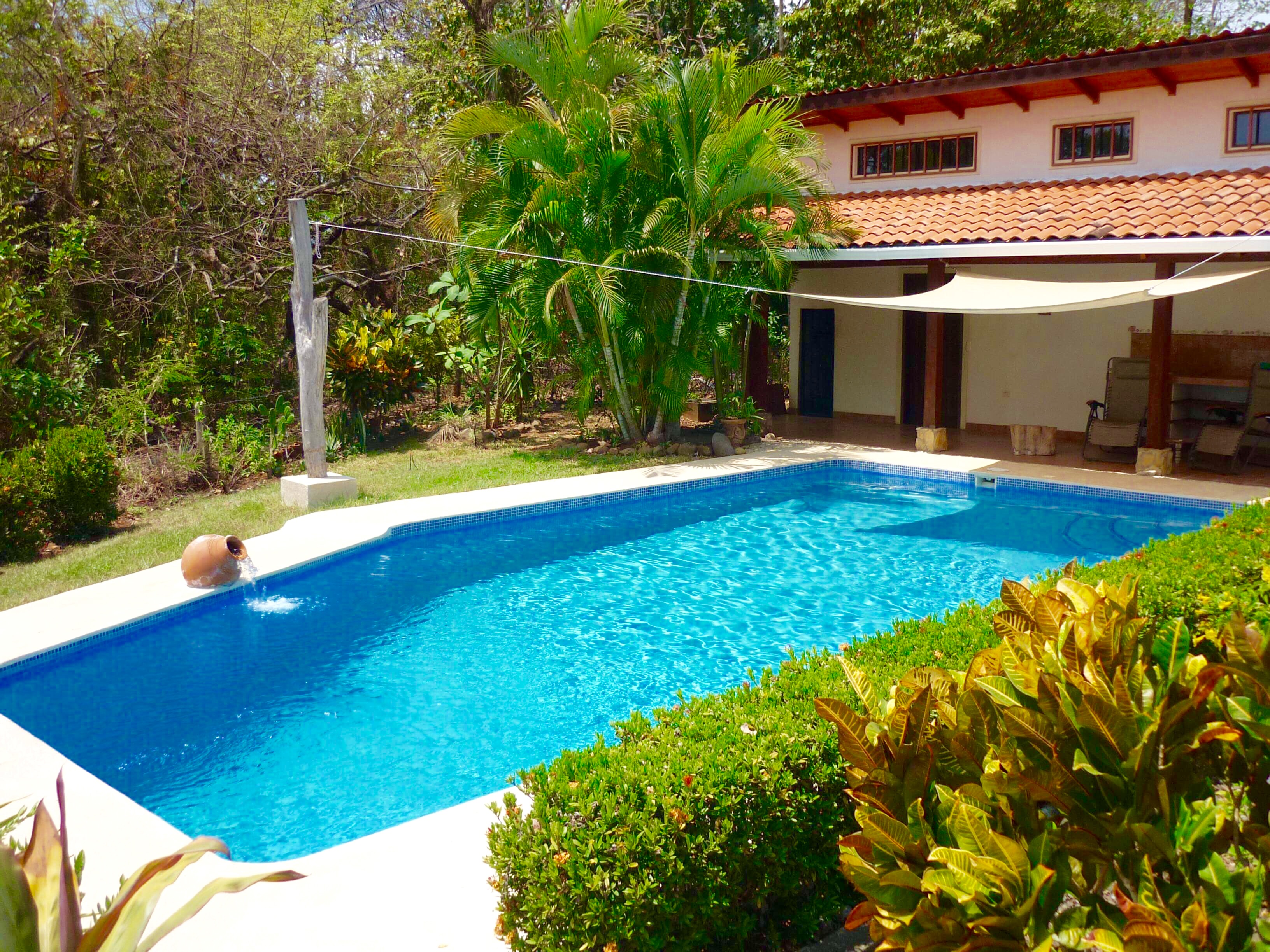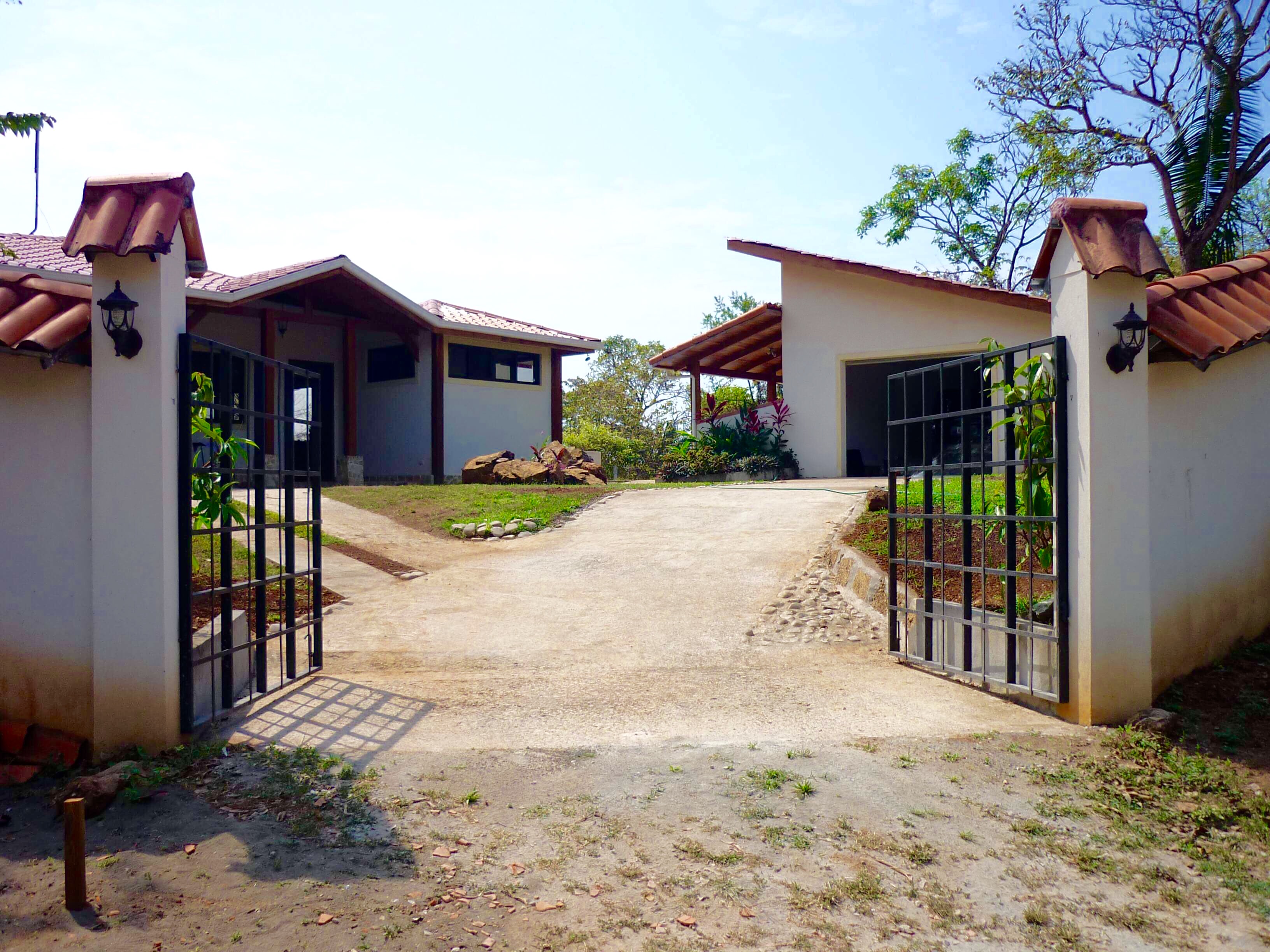 This beautiful ocean-view home stands peacefully on 1,537. 80m2 (.38 acre) at the end of a lush cul-de-sac, surrounded by nature and wildlife. It is the embodiment of tranquility and consists of 3 bedrooms and 3 bathrooms, a charming kitchen and dining area, and a refreshing outdoor patio area that enjoys a view of the ocean and is steps away from an impressive in-ground pool. The house is a spacious 115 m2 Â (1230 sq feet), furnished and decorated in good taste, and has a smoldering burnt orange ceramic tile throughout to set the tone. The property is fully fenced in and the grounds are neatly landscaped, boasting large sections of green grass that are perfect for children or pets to play and frolic on. The pool is an oasis. There’s also a huge detached garage with tons of space for storage and an area that can be converted into a studio or used for additional guest accommodations if desired. The good life is only an email away. Contact us to schedule a viewing today! Pura Vida!