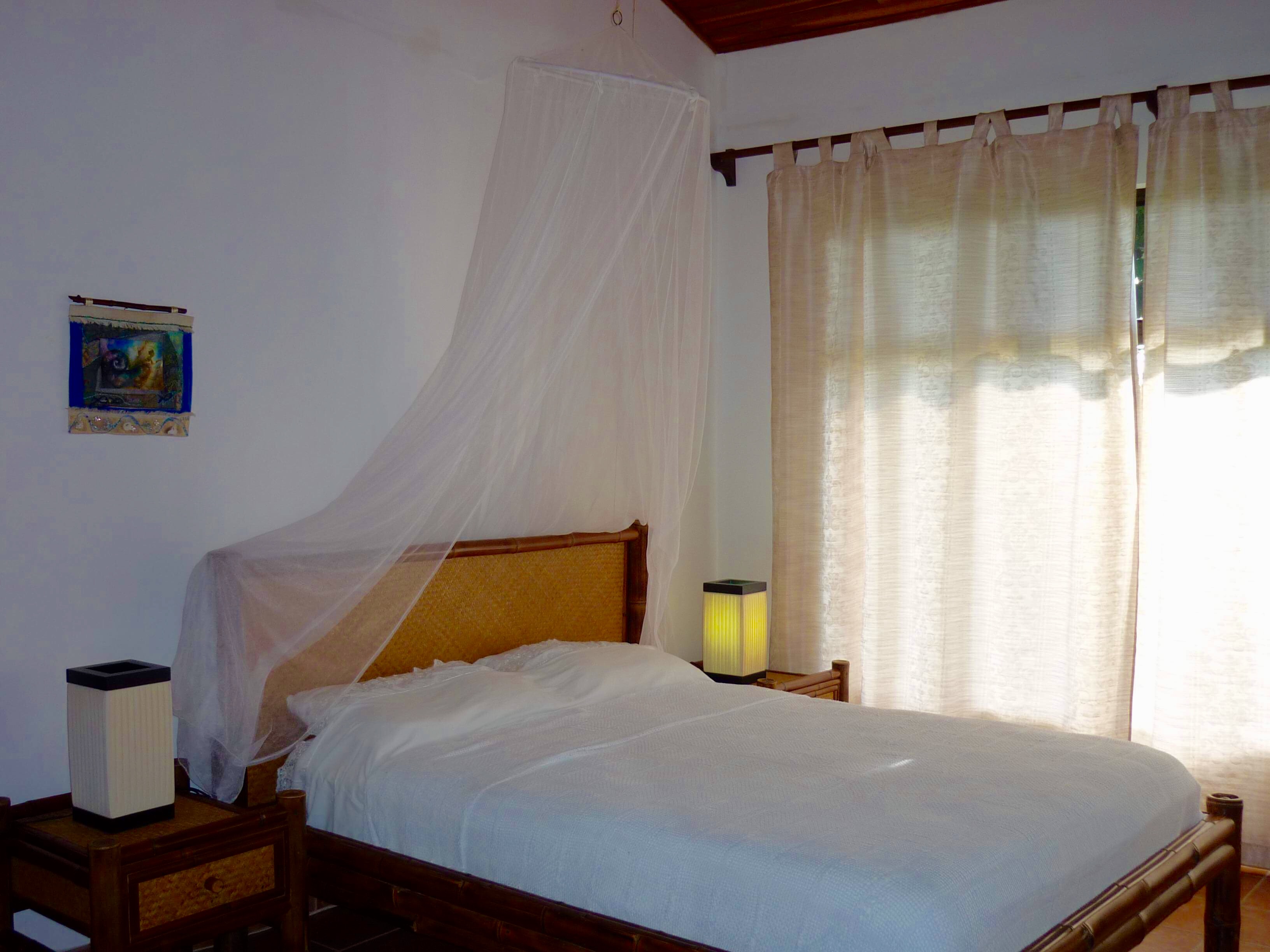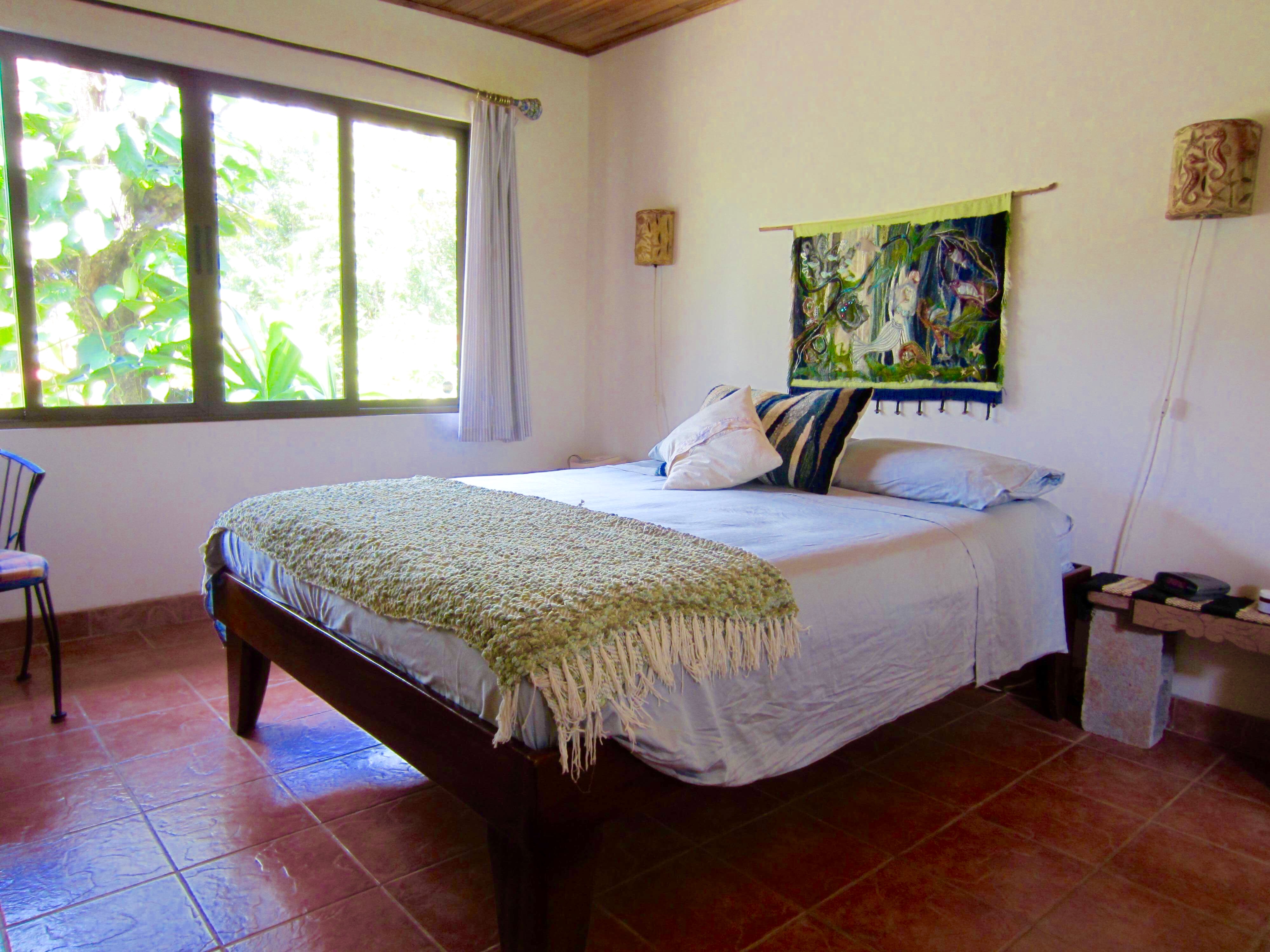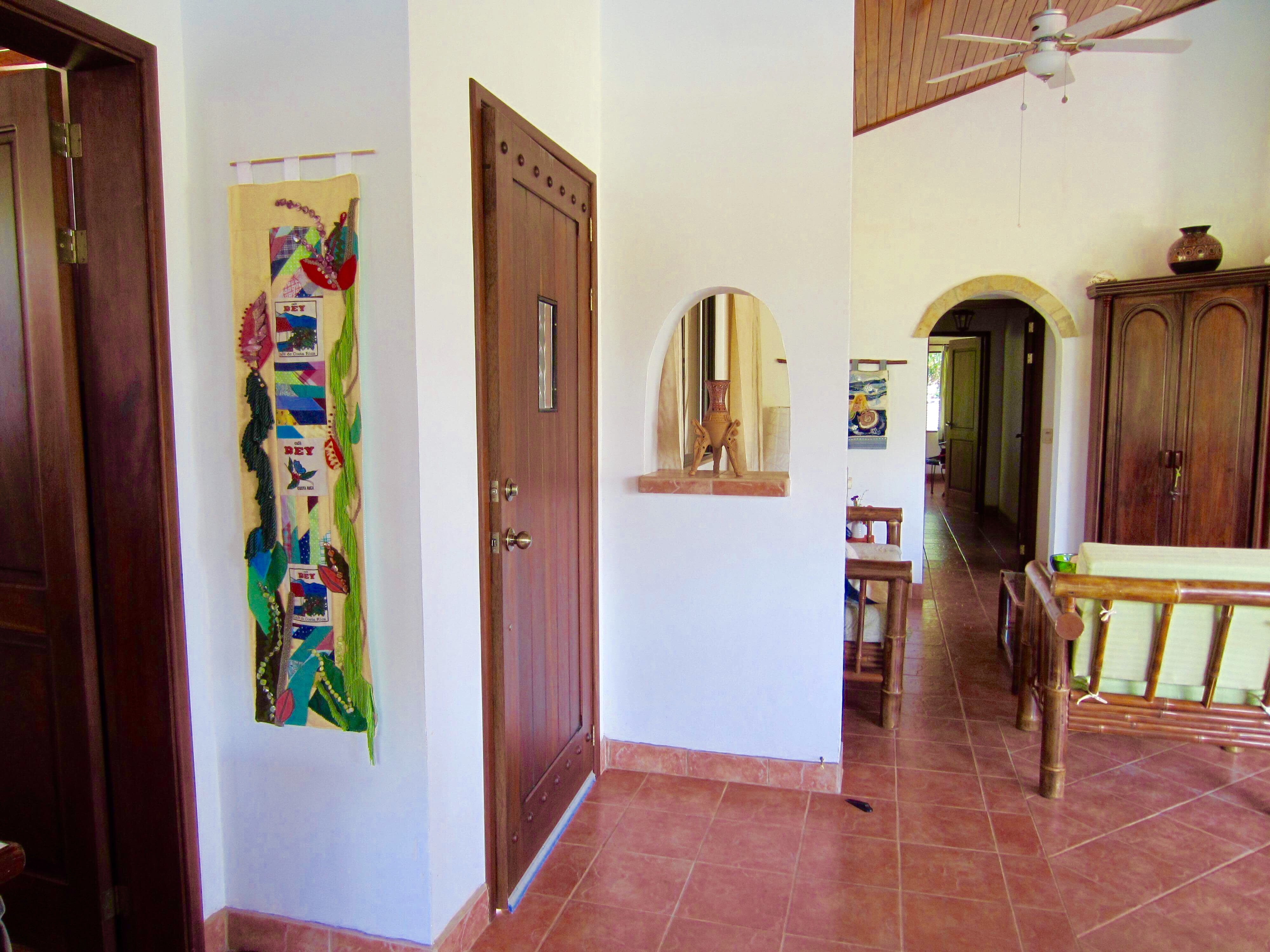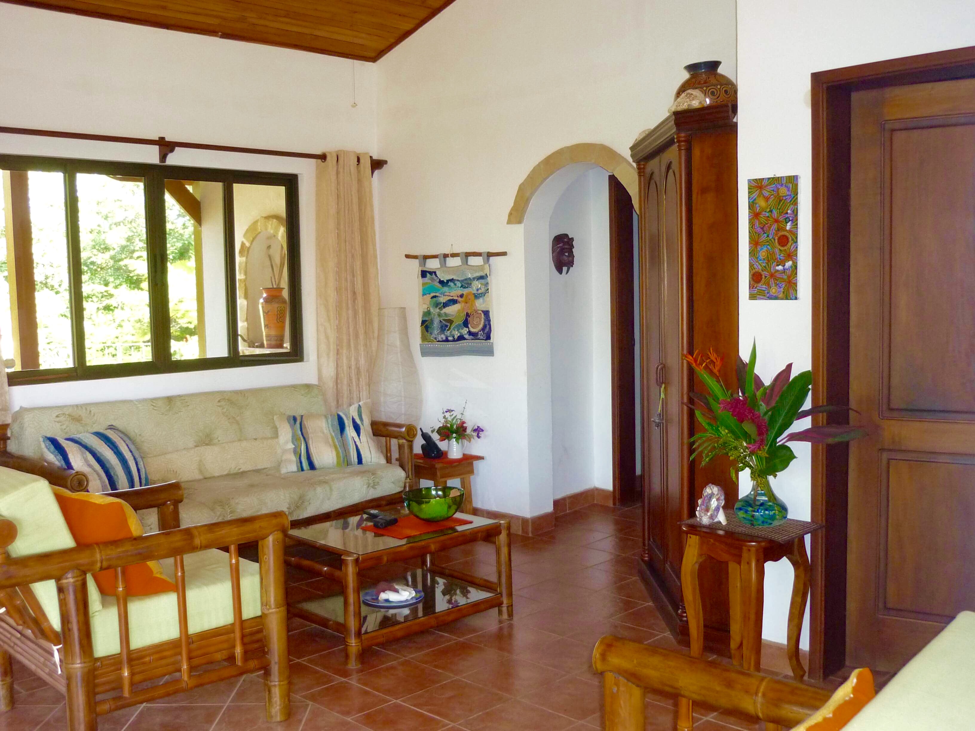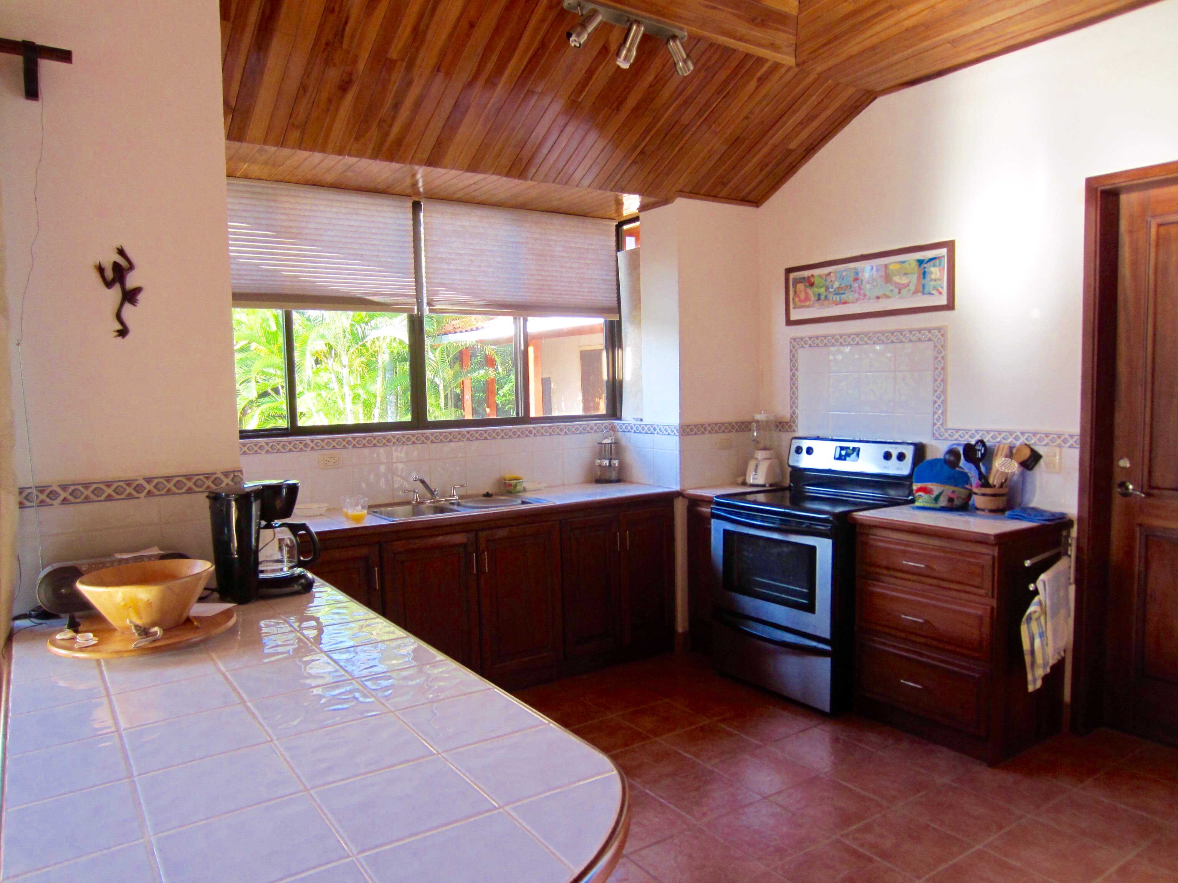 This beautiful ocean-view home stands peacefully on 1,537. 80m2 (.38 acre) at the end of a lush cul-de-sac, surrounded by nature and wildlife. It is the embodiment of tranquility and consists of 3 bedrooms and 3 bathrooms, a charming kitchen and dining area, and a refreshing outdoor patio area that enjoys a view of the ocean and is steps away from an impressive in-ground pool. The house is a spacious 115 m2 Â (1230 sq feet), furnished and decorated in good taste, and has a smoldering burnt orange ceramic tile throughout to set the tone. The property is fully fenced in and the grounds are neatly landscaped, boasting large sections of green grass that are perfect for children or pets to play and frolic on. The pool is an oasis. There’s also a huge detached garage with tons of space for storage and an area that can be converted into a studio or used for additional guest accommodations if desired. The good life is only an email away. Contact us to schedule a viewing today! Pura Vida!