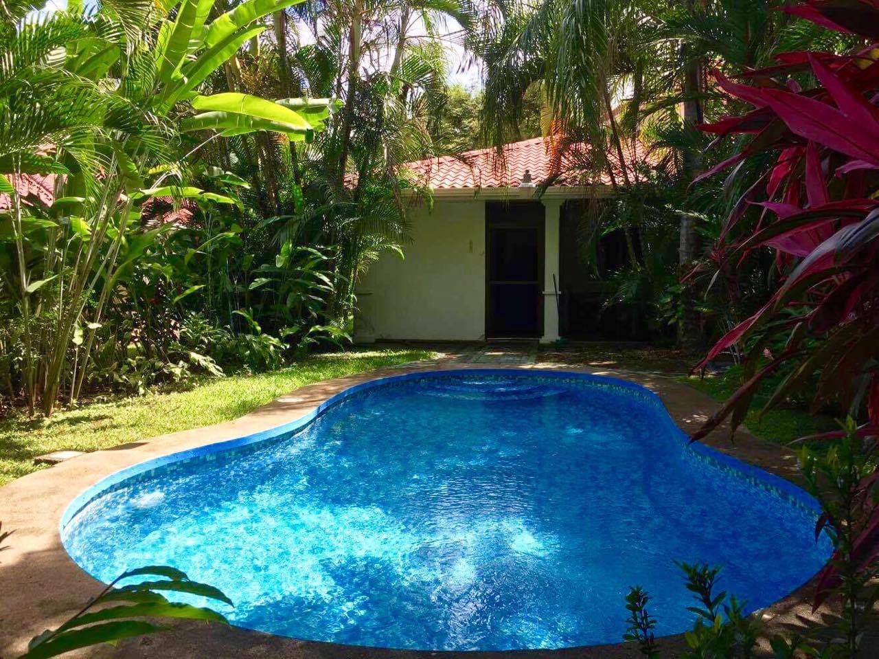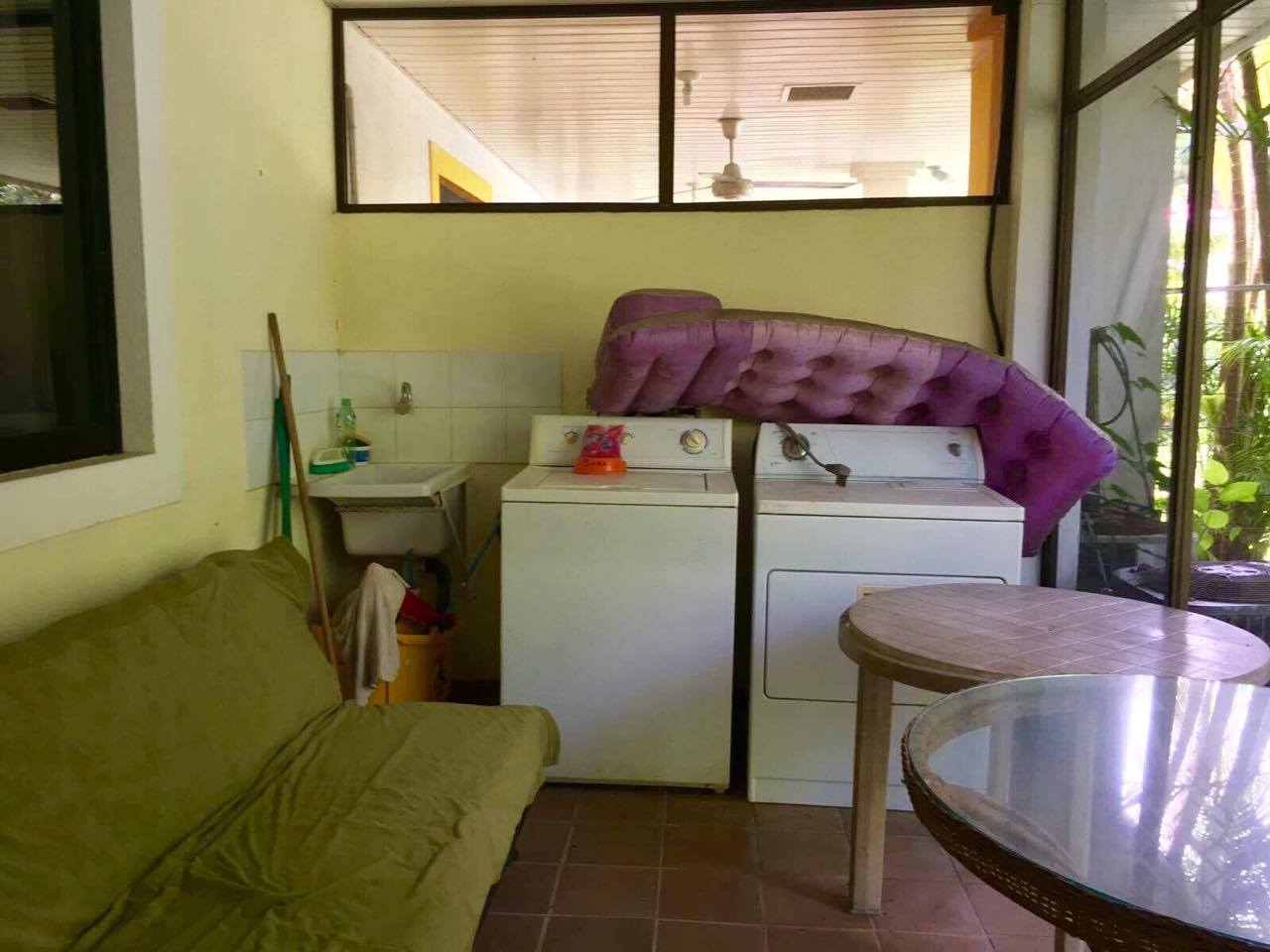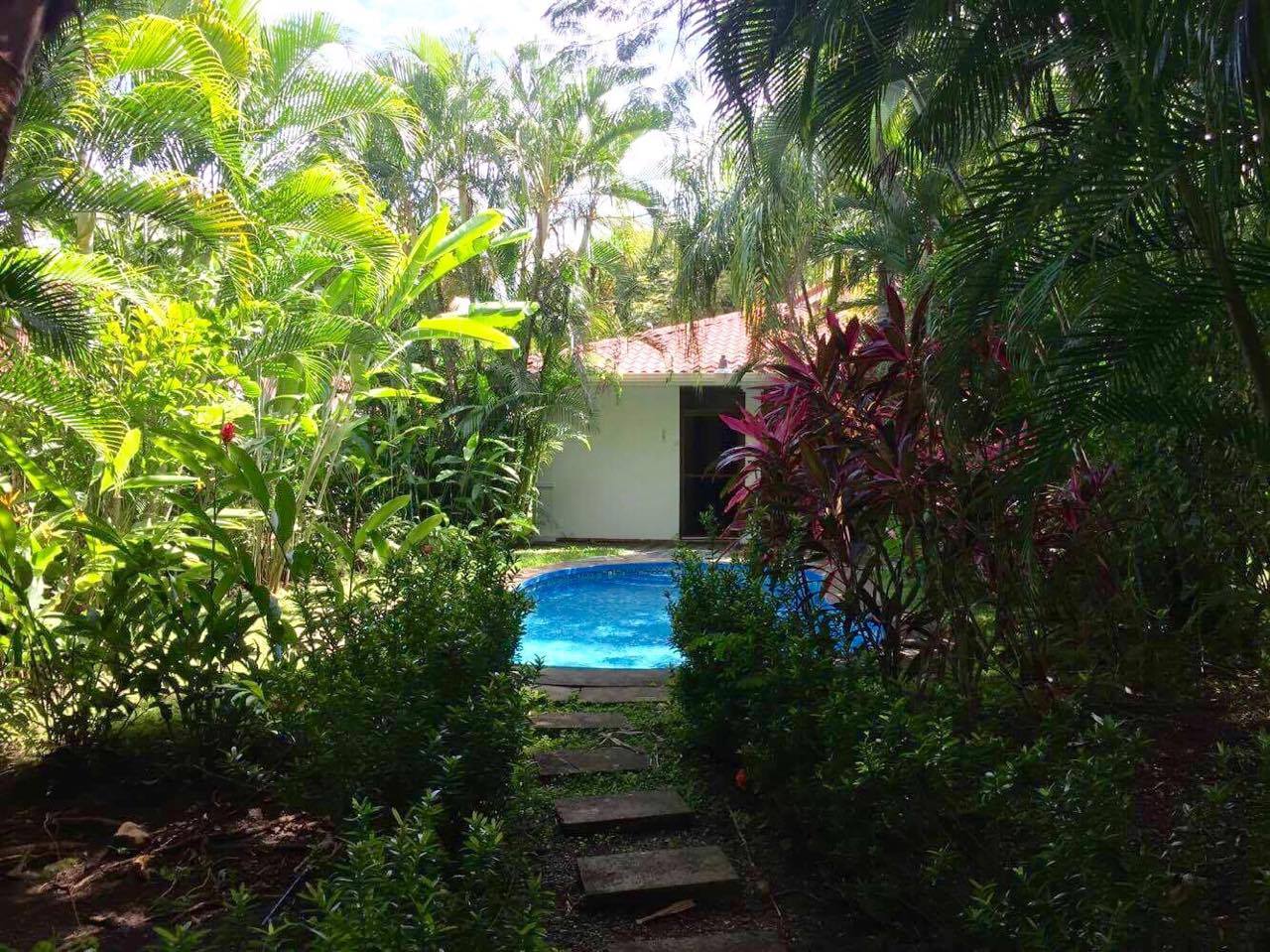 The townhouse was built in the late 90’s on a 498 m2 (5,360 square feet) stretch of land. The enclosed front patio allows for enjoyment of the neighborhood day or night, and is currently used as a sitting room with a dining table. Open the gleaming handcrafted wooden front door to enter the living-room which flows logically into the eat-in kitchen with local hardwood cabinets, an electric stove, a newer refrigerator, and a cozy breakfast bar. The townhouse is being sold 100% turn-key. The Master bedroom has a queen bed and the spare contains two twin beds. Each bedroom has a beautiful, well-ventilated, louvered wooden closet which promotes moisture control and provides ample storage. The Master Suite has a private bathroom with a bathtub/shower combo. The second full bathroom is located directly across the hall from the second bedroom, perfectly situated to accommodate the second bedroom and visiting guests. The enclosed patio facing the backyard is currently being used as a laundry-room and lounge area. Additional storage is available here as well. The rear patio opens up to a lush, secluded backyard complete with an inground pool, an outdoor shower, and surrounded by tropical landscaping. This is an ideal spot for a barbecue, a few cocktails, and some jungle relaxation. A creek runs along the back border bringing with it an array of wildlife for your viewing pleasure. Near the creek there’s an existing pad to build a gazebo/ rancho, a bodega/ storage shed, or a small casita. HOA rules and corresponding monthly fees apply to this property, and they include maintenance of the roads (paved), trash collection, and 24-hour security. With a little updating & love this gem will sparkle & shine again! Priced to sell. Make this slice of paradise your own for $135,000 USD FIRM. 100% turn-key, all you need to bring are your clothes and a toothbrush. Motivated Seller!!! Pura Vida!!!