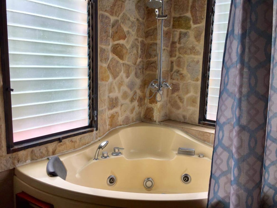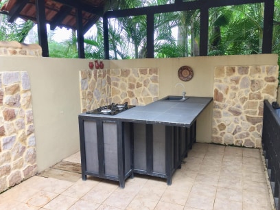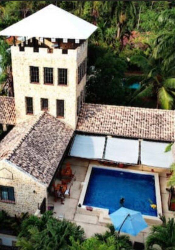 Villa Bali Resort is an impressive stone villa nestled within the Costa Rican jungle in the tranquil hills of Tambor. The resort features nine (9) private rooms and bungalows with a total of ten (10) full bathrooms. Each room has its own bathroom, safe, TV, mini fridge, coffee maker, and air conditioning unit. The top unit boasts a stunning view of the Pacific Ocean. Vista Bali Resort has a large kitchen and dining area around the pool which functions as a restaurant that is open for hotel guests and also to the public. There’s an elevated tiki bar, gorgeous landscaping, and a large parking lot.